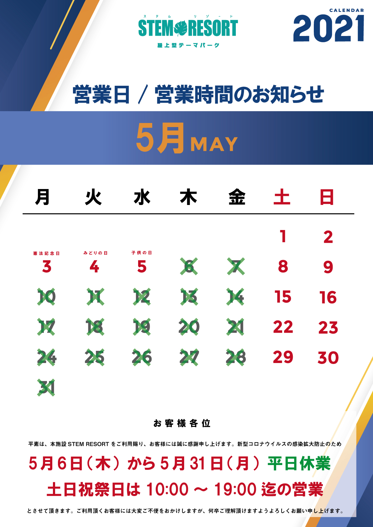平素は、本施設STEM RESORTをご利用賜り、お客様には誠に感謝申し上げます。 新型コロナウィルス感染拡大防止のため、営業日及び営業時間を下記の通り変更・短縮することになりました。 お客様には大変ご迷惑をおかけします […]